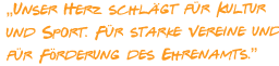 Immer mehr ist ein Rückgang an ehrenamtlichem Engagement zu beklagen, nicht zuletzt weil diese Einsätze sehr oft ohne angemessene Anerkennung unserer Gesellschaft bleiben. Ehrenamtliches Engagement braucht Würdigung und Anreize, um Bürgerinnen und Bürger zu finden, die bereit sind, sich für die Gesellschaft einzubringen. Damit geht einher die notwendige Förderung des örtlichen Vereinswesens als wichtiges Element für ein lebendiges Gemeinwesen. Hier liegt das Haupteinsatzfeld für das ehrenamtliche Engagement.